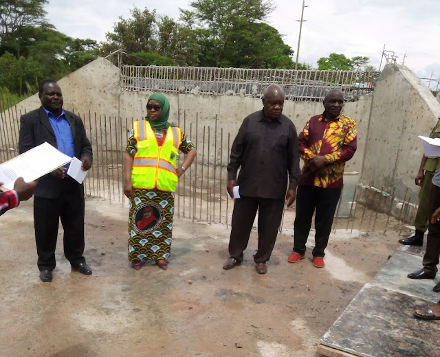 | Mkuu wa Mkoa wa Katavi, Mwanamvua Mrindoko (kwenye picha wa pili kushoto) akiwa anakagua daraja dogo linalotumika kupitishia maji katika bwawa la maji Nsekwa. (Picha na Walter Mguluchuma) |
